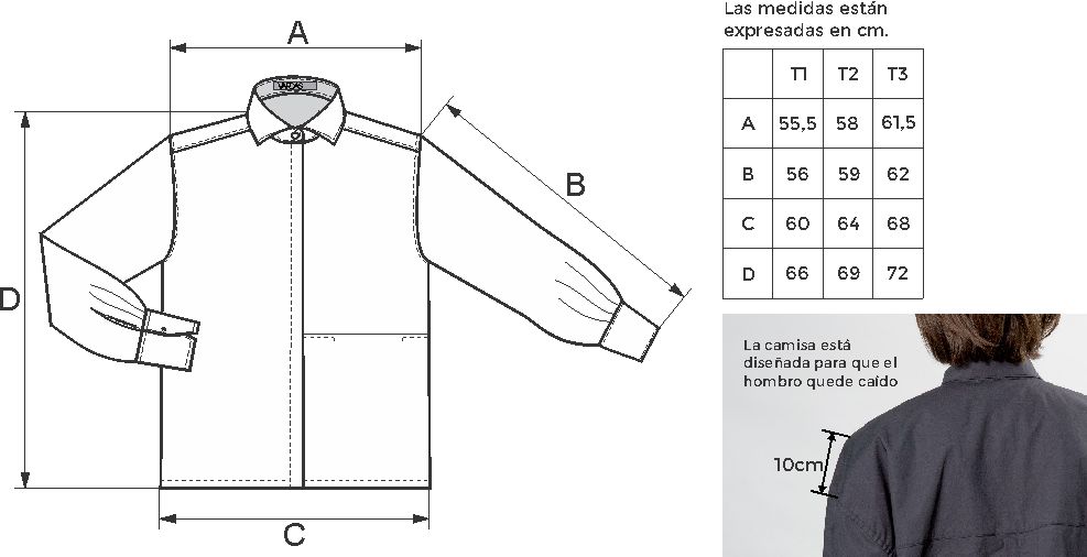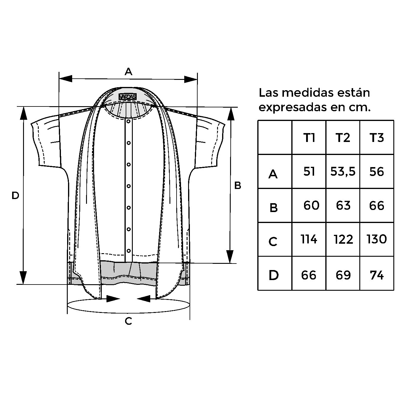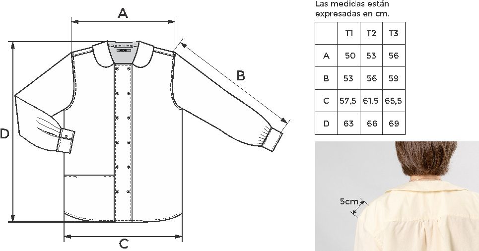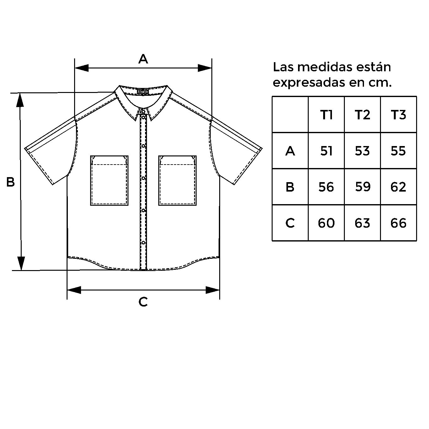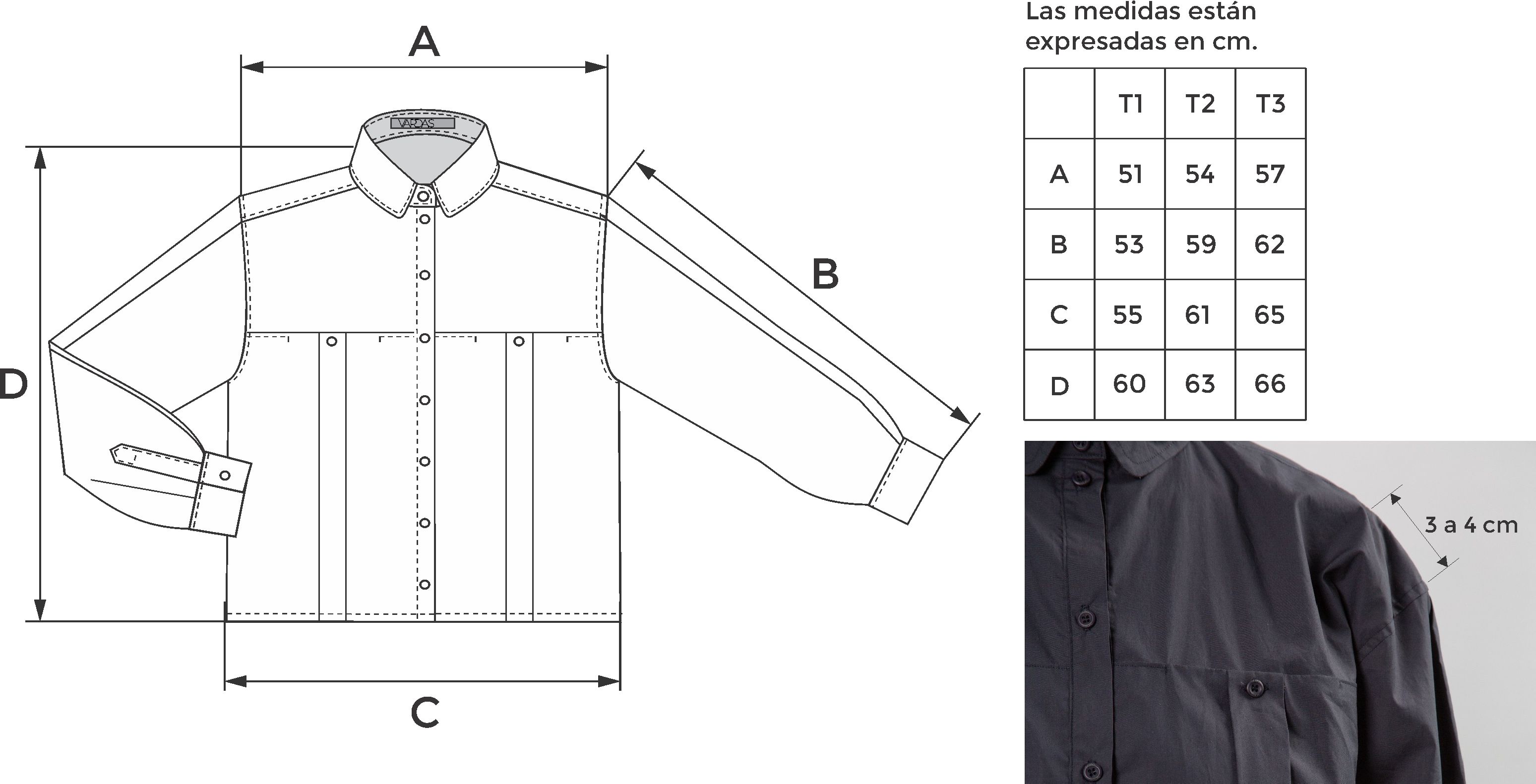 Dos bolsillos con tablas y botones.Cuello estilo club.Tabla en espalda y en mangas.Confeccionada en poplin 100% algodón.Viene en blanco, crema y azul noche